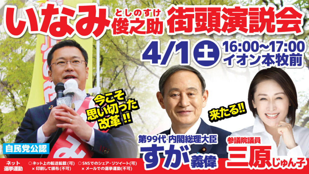 2023年3月31日【横浜市議会議員選挙】4/1、イオン本牧前にていなみ俊之助街頭演説会開催 来たる!! 菅義偉第99代内閣総理大臣来たる!! 三原じゅん子参議院議員 いなみ俊之助街頭演説会を開催いたします。日時:2023年4月1日(土)16:00〜17:00場所:イオン本牧前にて 4/9(日)は横浜市議会議員選挙の投票日です! ※下記データに関しまして印刷しての頒布は禁止されておりますのでご注意ください ↑クリックで大きい画像(PDF)が開きます ↑クリックで大きい画像(PDF)が開きます ↑クリックで大きい画像(PDF)が開きます